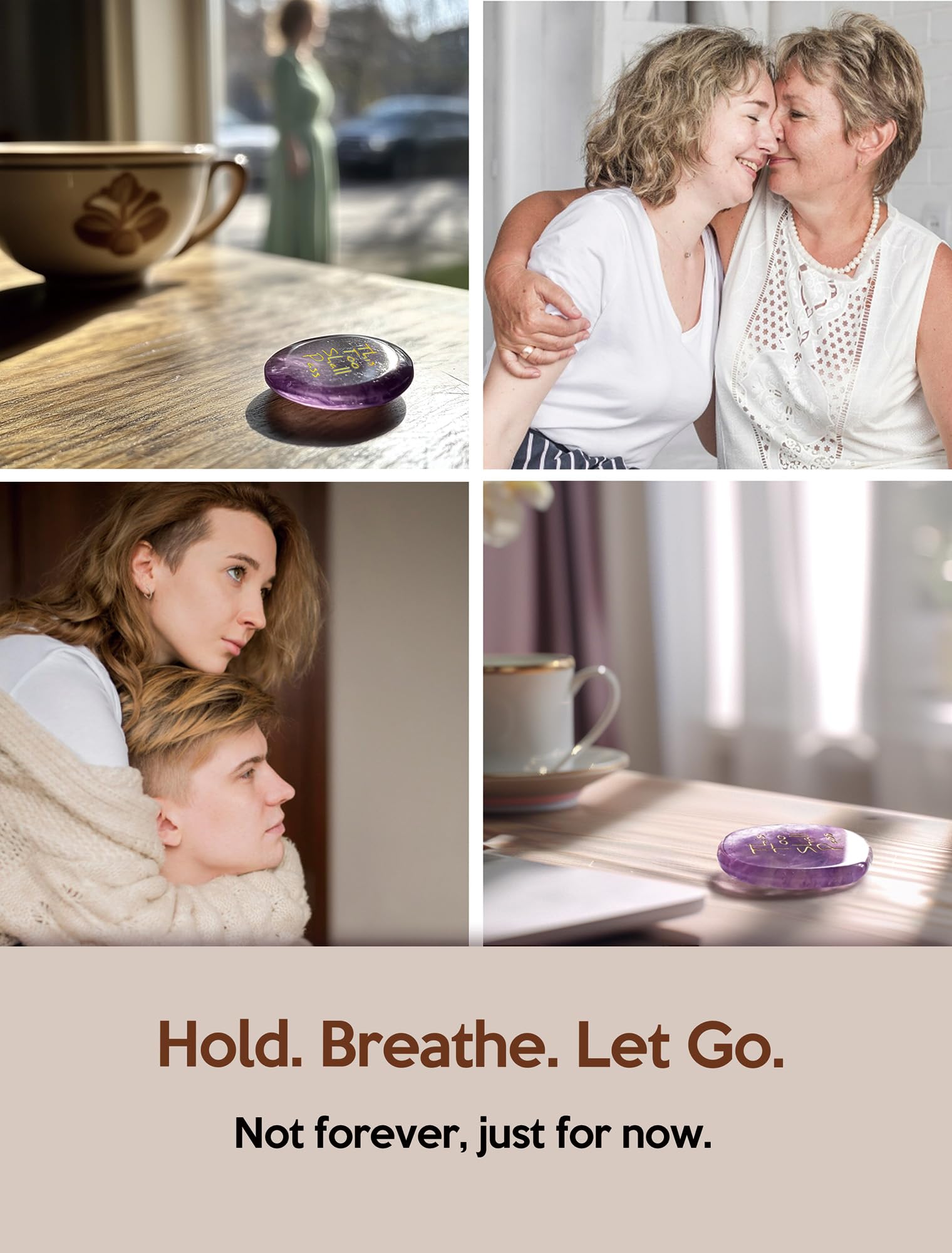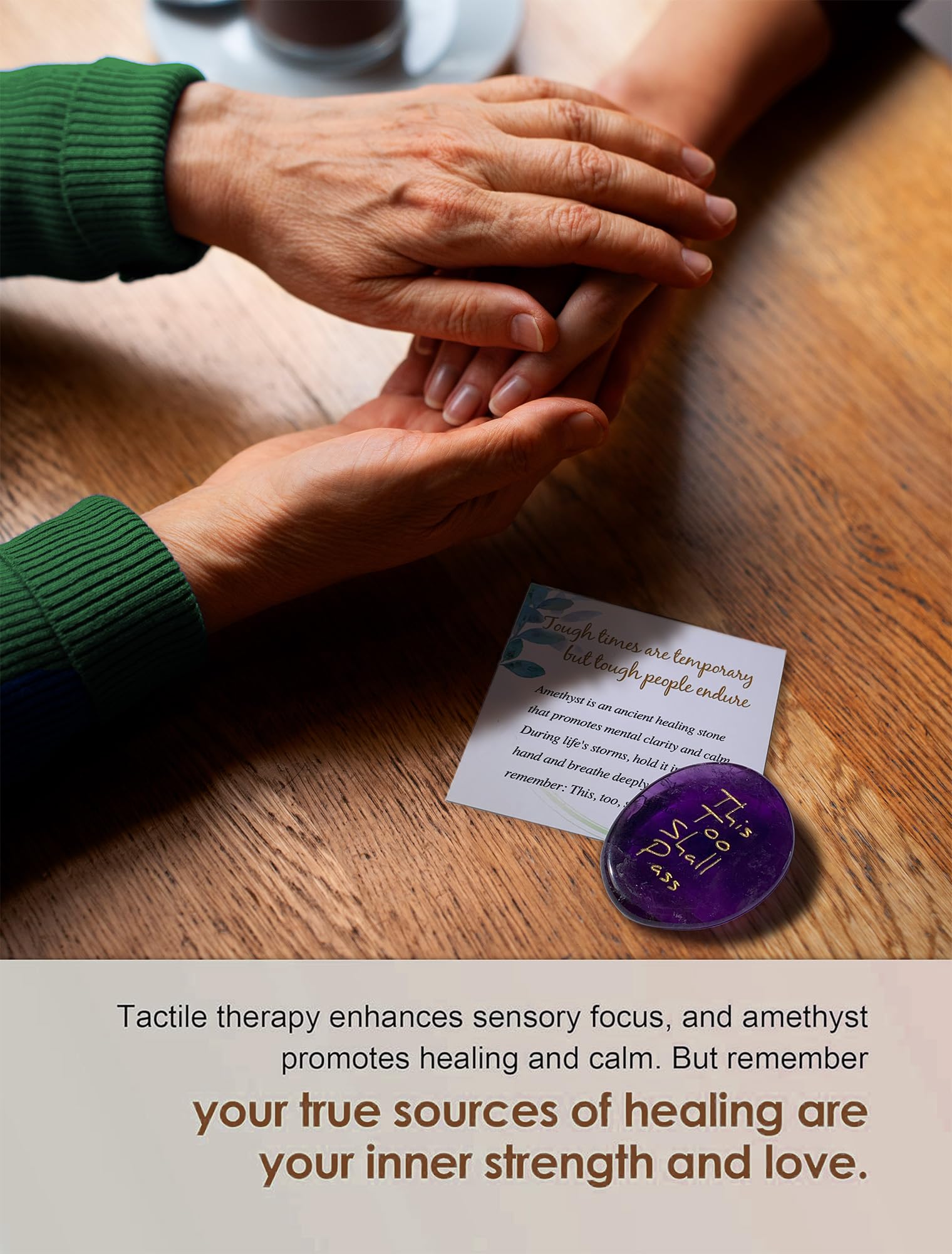 - IN POCKET THERAPY: Amethyst is an ancient healing stone that promotes mental clarity and calm. When you are anxious or under daily stress, or when your mind is overactive, hold the crystal in your hand, touch its soothing surface with your palm or thumb, and trace the carved words “This Too Shall Pass.' Focusing on your senses can help you ground your sensors. Feel its grounding and relaxing effects, and remember that you are worthy and loved