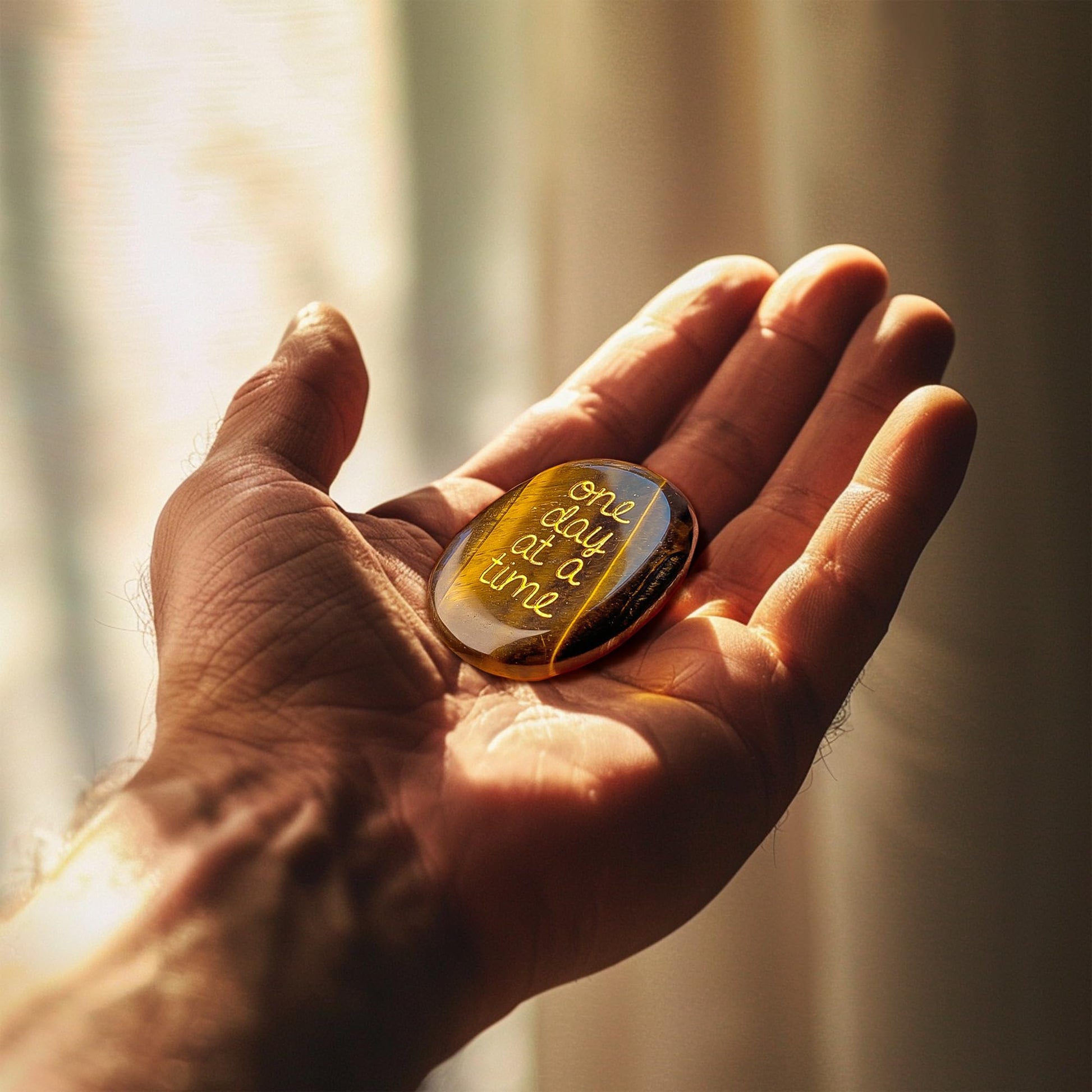 - HOW TO USE: When you're feeling anxious or stressed, hold the crystal in your hand, feel its smooth surface with your palm or thumb, and trace the carved words 'One Day At A Time.' Feel its calming and relaxing effects, and remember that you are worthy and loved. You are enough