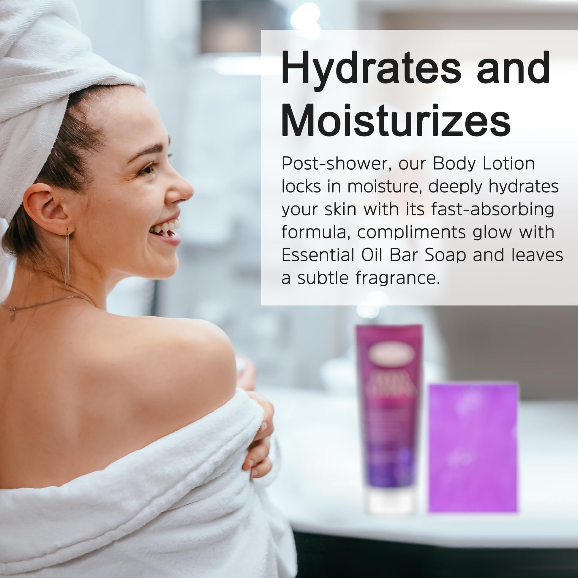 - Hydrates and Moisturizes: Lock in the moisture after a refreshing shower with our hydrating Body Lotion.Its fast-absorbing formula drenches your skin in rich moisture,with Essential Oil Bar Soap,enhances its glow and leaves a delightfully subtle fragrance