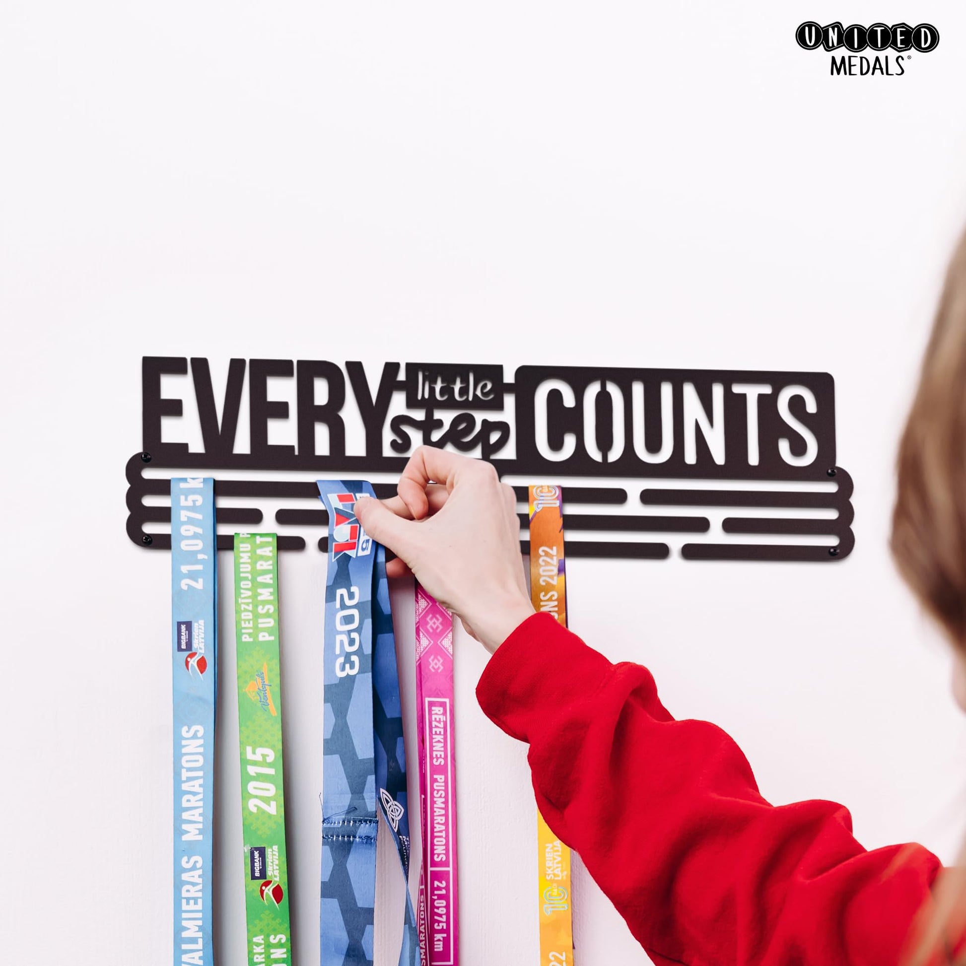 Sports Medal Hanger Display Race Every Little Step Counts | Black Race Medal Holder Awards Wall Mount | Running Marathon Race Medal Display for Wall | Steel medal holder for wall holds up to 48 Medals
