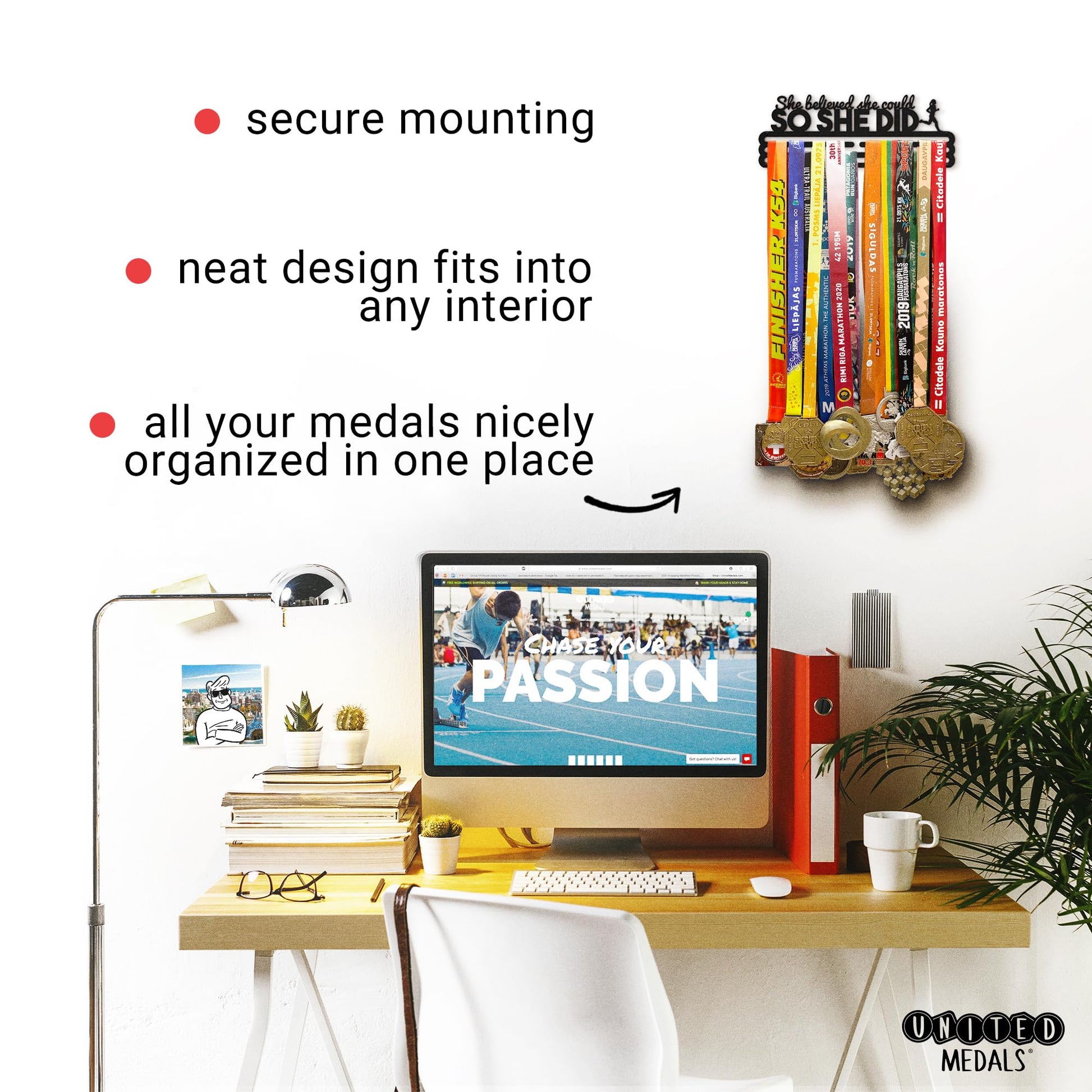 Details: United Medals SHE BELIEVED SHE COULD medal hanger is the best place for your medals! We believe your medals would do better if stored outside the cupboard. You worked hard for them, so why not display them with pride? Our medal holder will help. It comes with everything you need to mount it on the wall, including a set of universal screws, wall plugs, 3mm nylon spacers, and detailed mounting instructions. Using a minimum set of tools and following the simple steps, it takes just a few minutes to mount a United Medals medal hanger onto the wall. - Finishing: powder coating (matte black) / powder coating (vivid red) / brushed stainless steel - Material: 2mm carbon steel for powder coated versions and 2mm stainless steel for brushed version- Package contents: medal hanger, mounting hardware, installation instructions Since 2017, our products decorate walls of thousands of athletes in more than 50 world countries, helping to store their medal collections in a neat and organized way, and have proved to be a great item for personal use or as a gift for a sporty friend.
