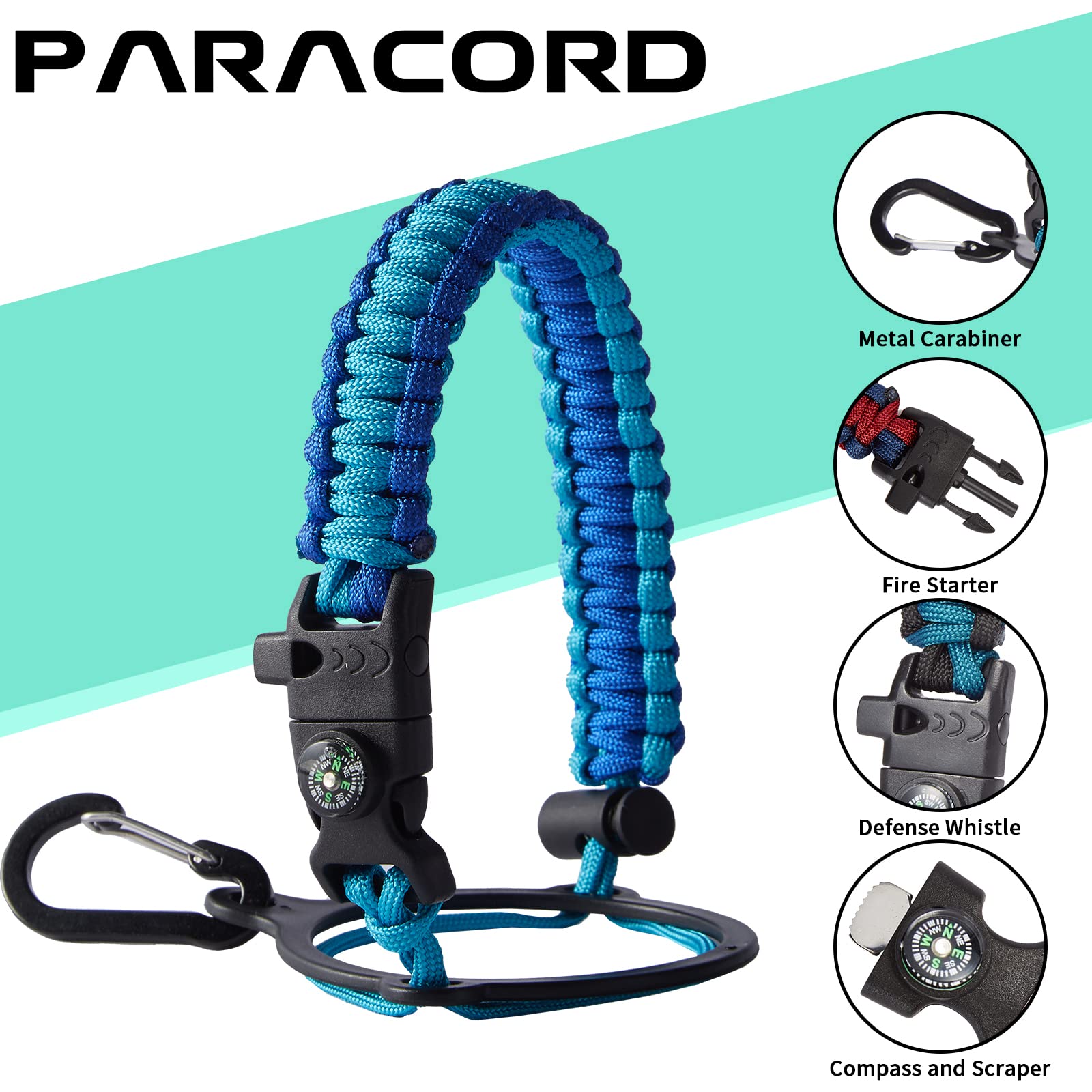 - UNIQUE PARACORD HANDLE: Bright color paracord matches the flask water bottle to give you a youthful vibe while adding a personal style. With a compass, safety loop, metal carabiner, flint, igniter and whistle to become your survival tool, making the 32 oz stainless steel water bottle with paracord an ideal survival kit for expeditions in the wild