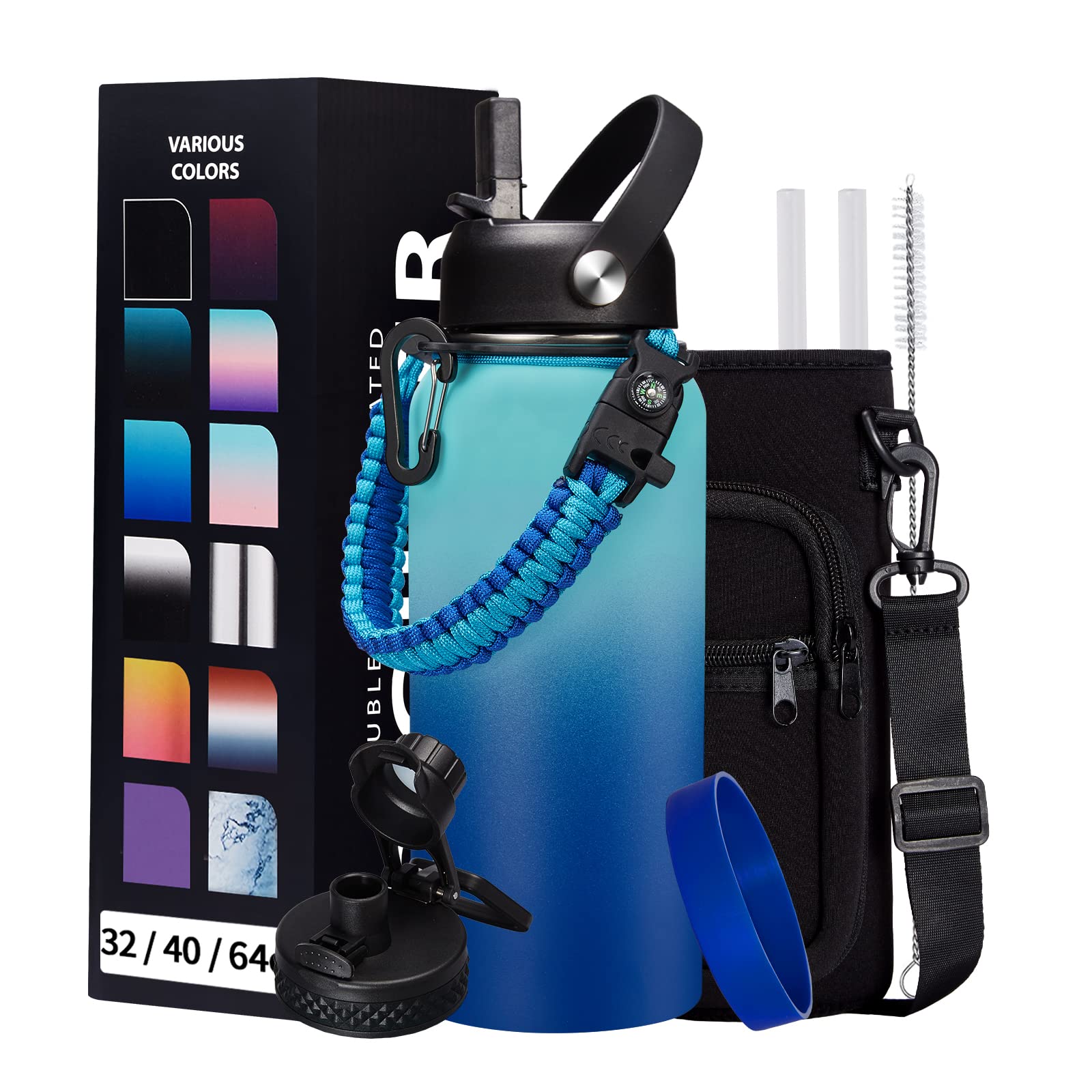 - SUPER JOYFUL COMBO: Buy 32oz insulated water bottles and get 9 accessories (2 x lids, 1 x survival paracord, 1 x carrying pouch, 1 x shoulder strap, 1 x protective cup mat, 2 x straws, 1 x straw brush). WITH A LIFETIME GUARANTEE, these thermal water bottles are perfect gifts for using at home, work, school, road trips, hiking, sporting events, or just hanging out