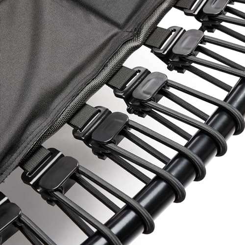 - 【ADJUSTABLE BOUNCE SETTINGS】Adjust the tension of your bungee trampoline by tying extra knots in the cords. This lets you increase firmness for a more intense bounce or loosen it for a softer landing, customizing your workout for maximum comfort.