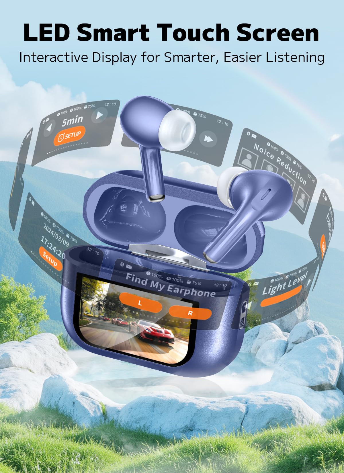 - Next-Gen Touchscreen Earbuds for Seamless Control: Wireless earbuds featuring a Smart Multifunctional Touch Screen Charging Case offer a revolutionary listening experience. Unlike traditional models, noise cancelling earbuds with this design let you control volume, skip tracks, manage calls, set alarms, and even locate your ear buds—all directly from the case, no phone needed. A smarter, more convenient way to stay in control