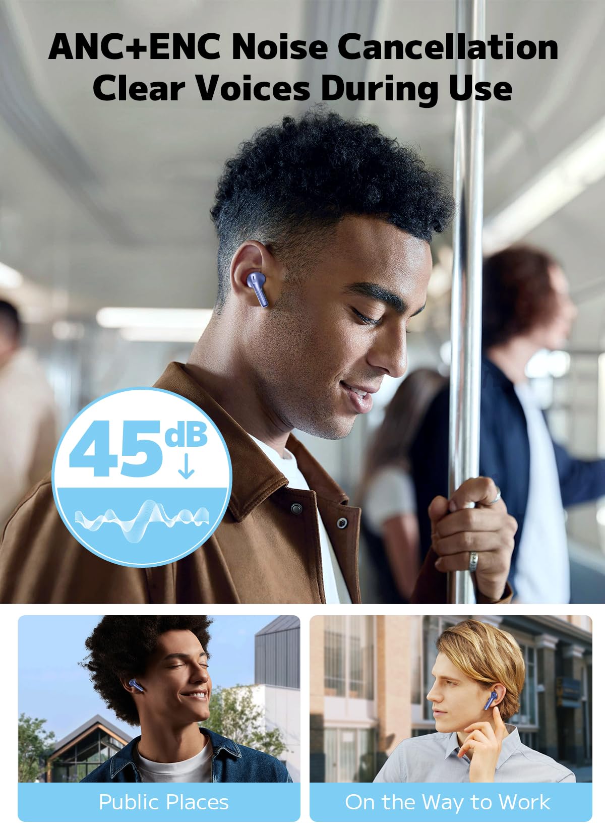 - Professional Noise Cancelling Headphones: True wireless earbuds with ANC + ENC block ambient noise and deliver crystal-clear calls. Whether listening to music, watching shows, or on business calls, the moment you wear the earbuds, noise disappears. Four adjustable noise-cancelling modes let you customize settings via the charging case for the optimal experience