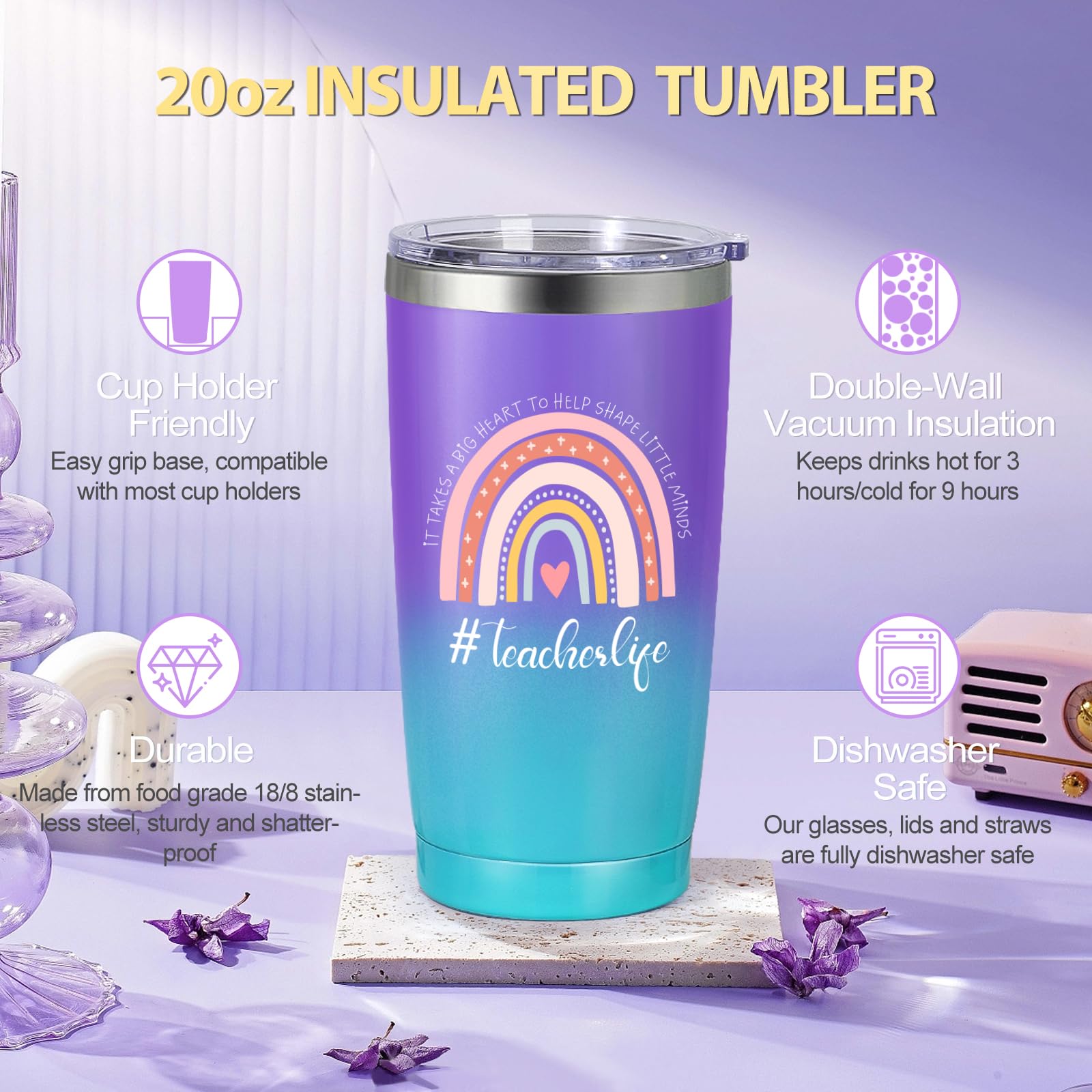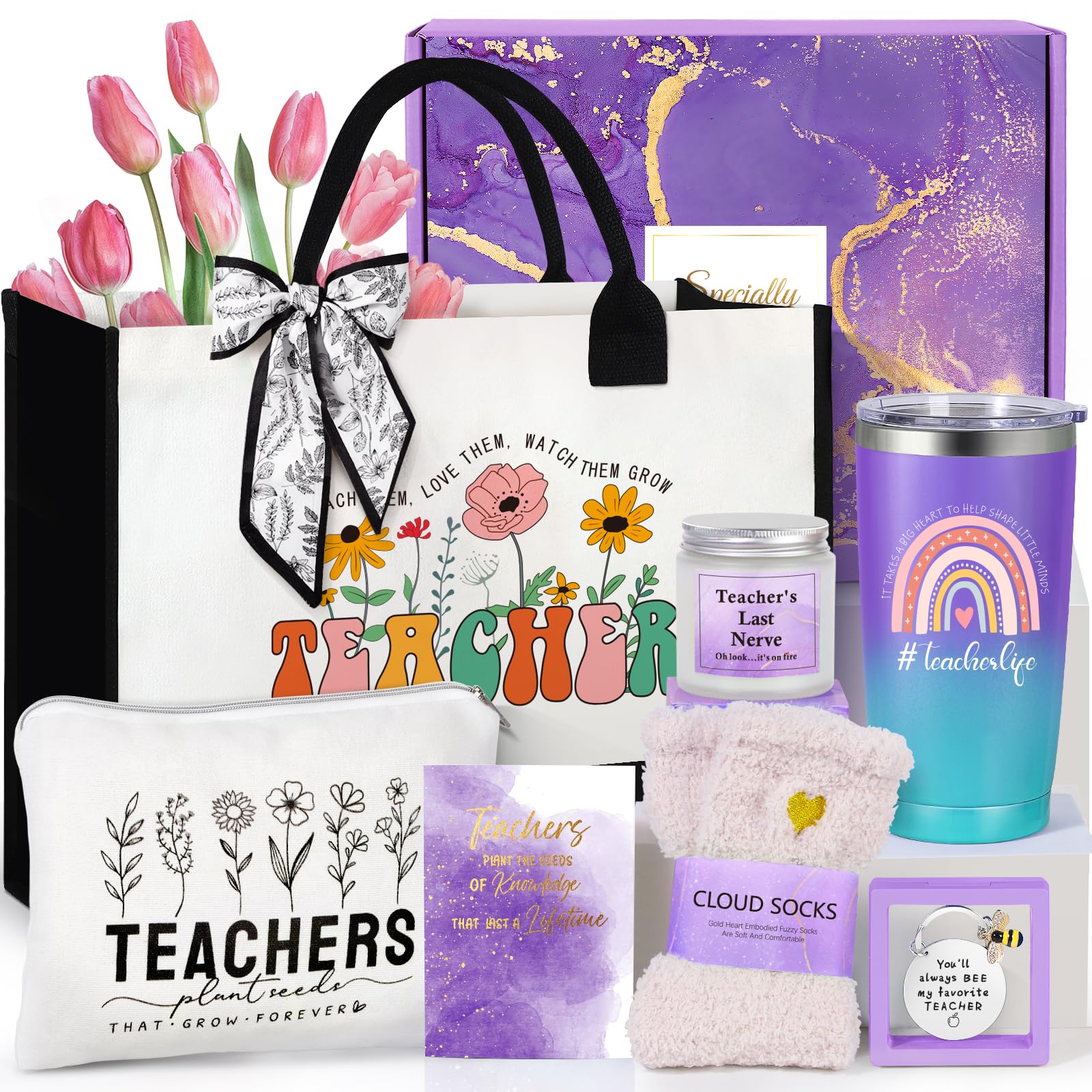 - AN UNFORGETTABLE UNBOXING: This beautifully curated teacher appreciation gifts includes: 1 x 20 Oz Insulated Tumbler (with Straw & Brush), 1 x Reusable Grocery Bag, 1 x Cosmetic Pouch Bag, 1 x Lavender Scented Candle, 1 x Fun Keychain, 1 x Soft Fuzzy Socks, 1 x Hair Scarf (also doubles as a ribbon), and 1 x Double-Sided Greeting Card (Write your appreciation and gratitude to your teacher inside, and send her your best wishes!)