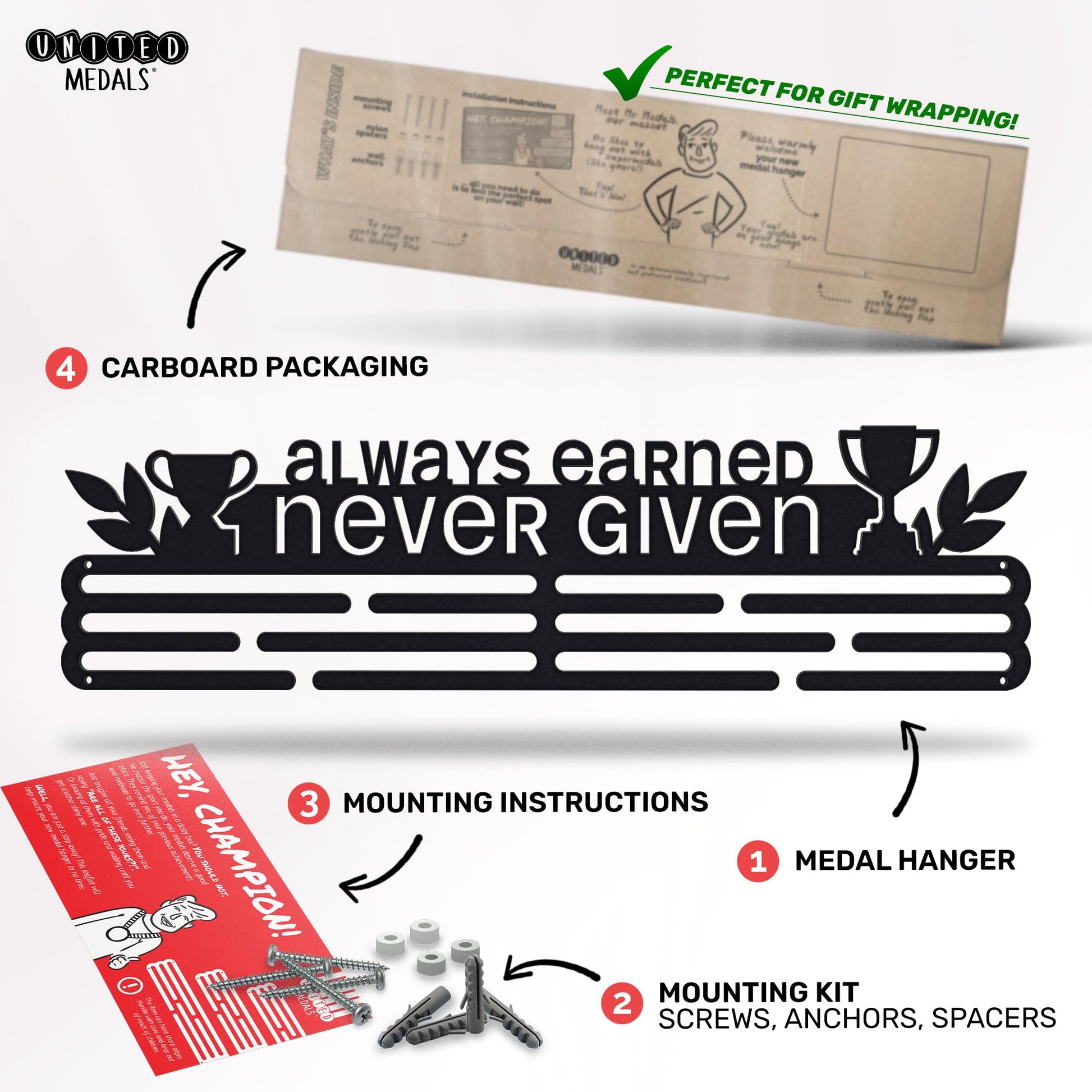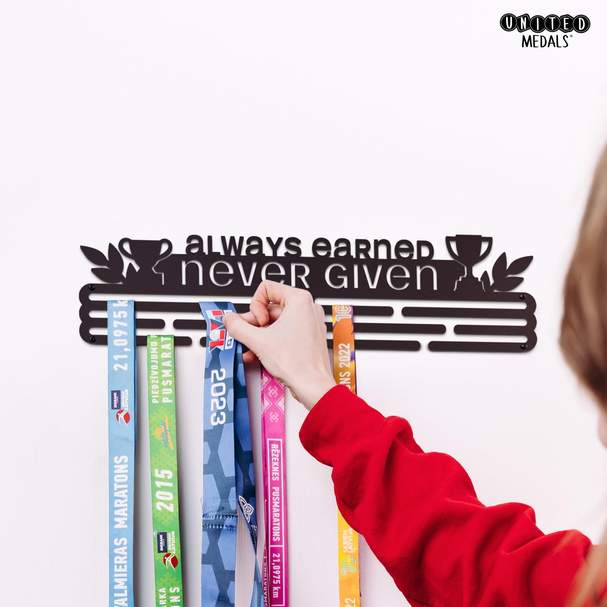 United Medals Sports Medal Hanger Display Race ALWAYS EARNED NEVER GIVEN | Black Race Medal Holder Awards Wall Mount | Running Marathon Race Medal Display for Wall | Steel medal holder for wall