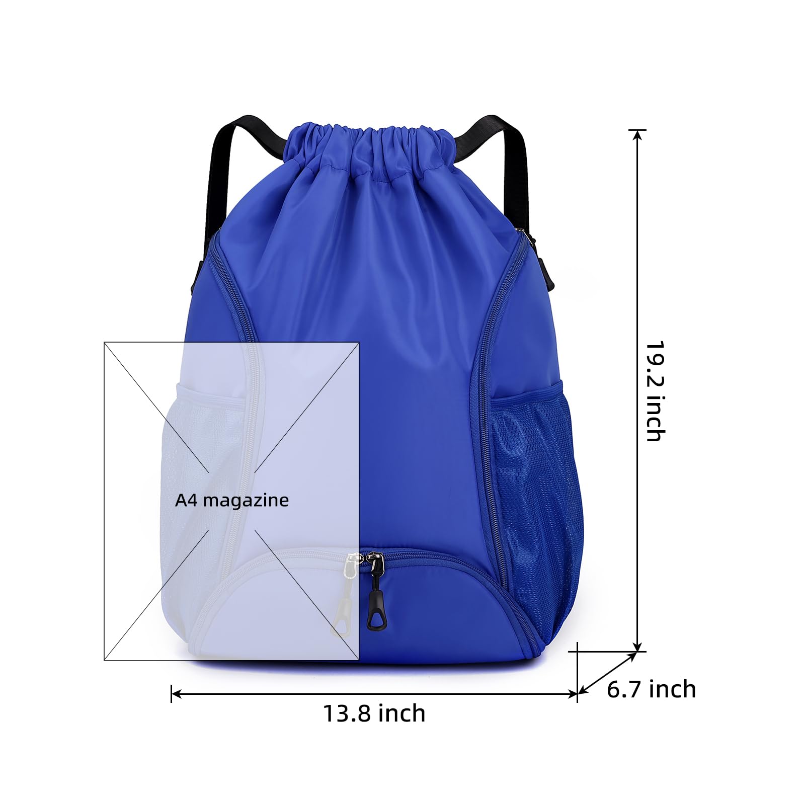 - Internal structure: The size of the men's drawstring backpack is 13.7*6.7*19.2 inches, including a main bag, a front side bag, a front bag, and two side bags, which is enough to accommodate daily necessities such as basketballs, fitness clothes, swimming equipment, sports towels, etc.;