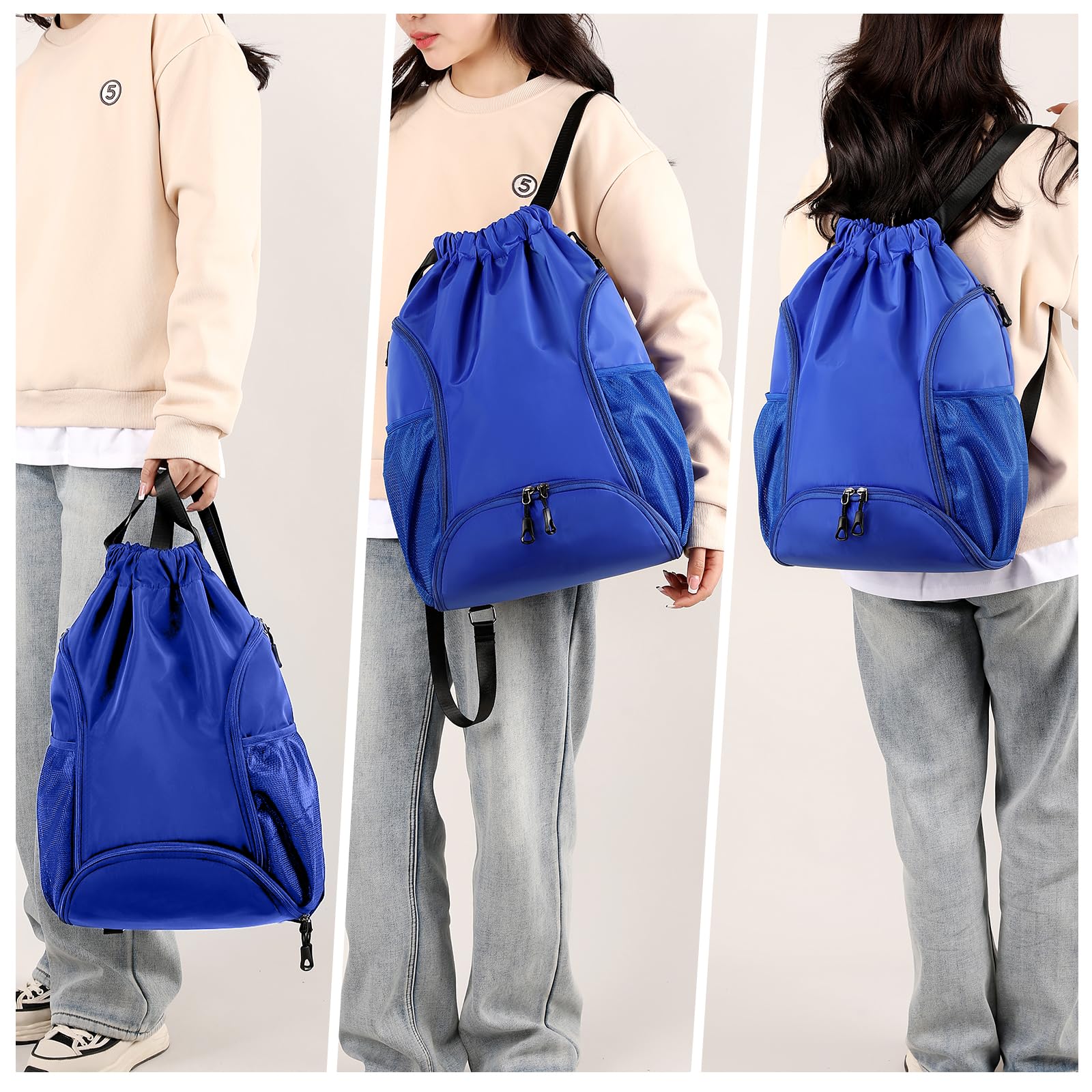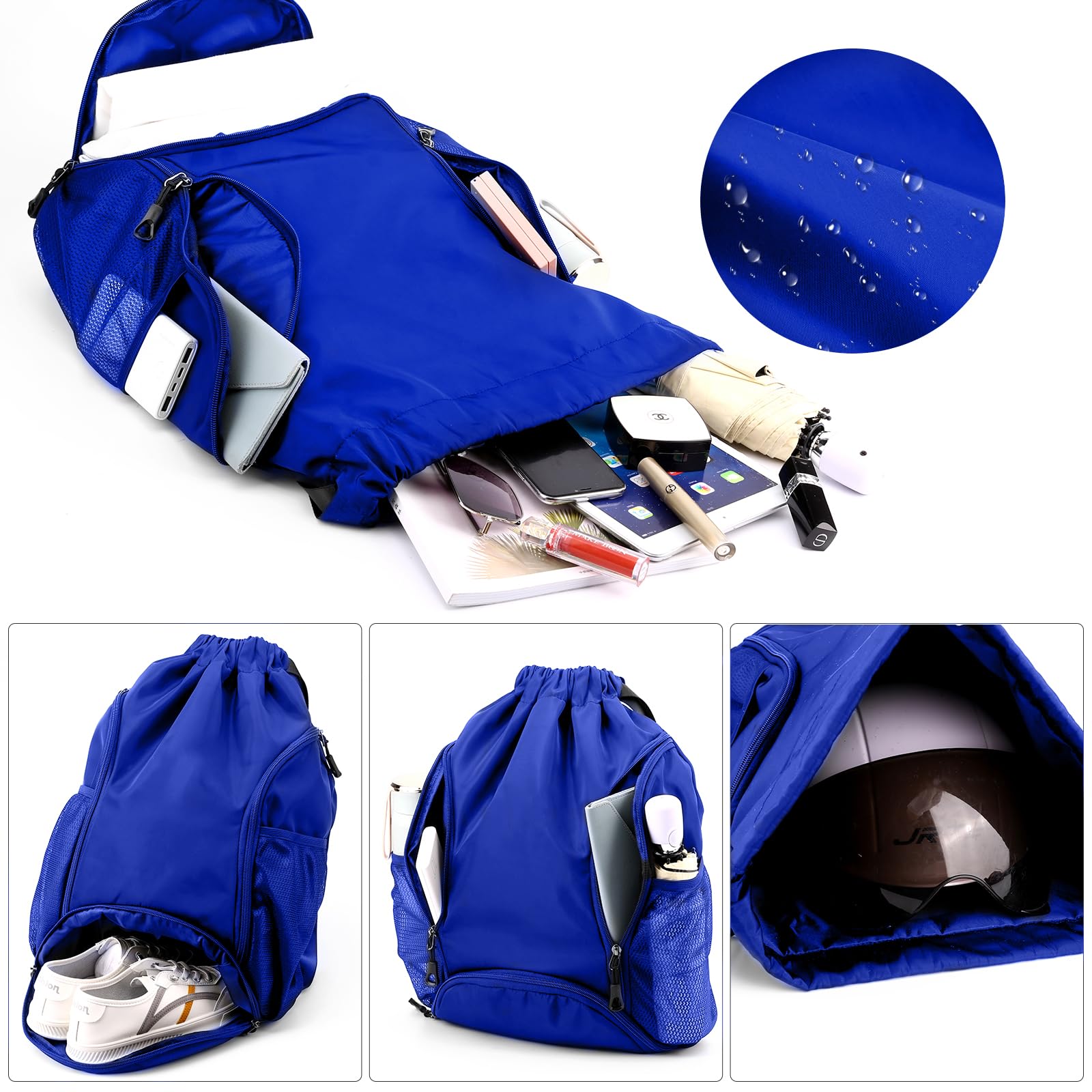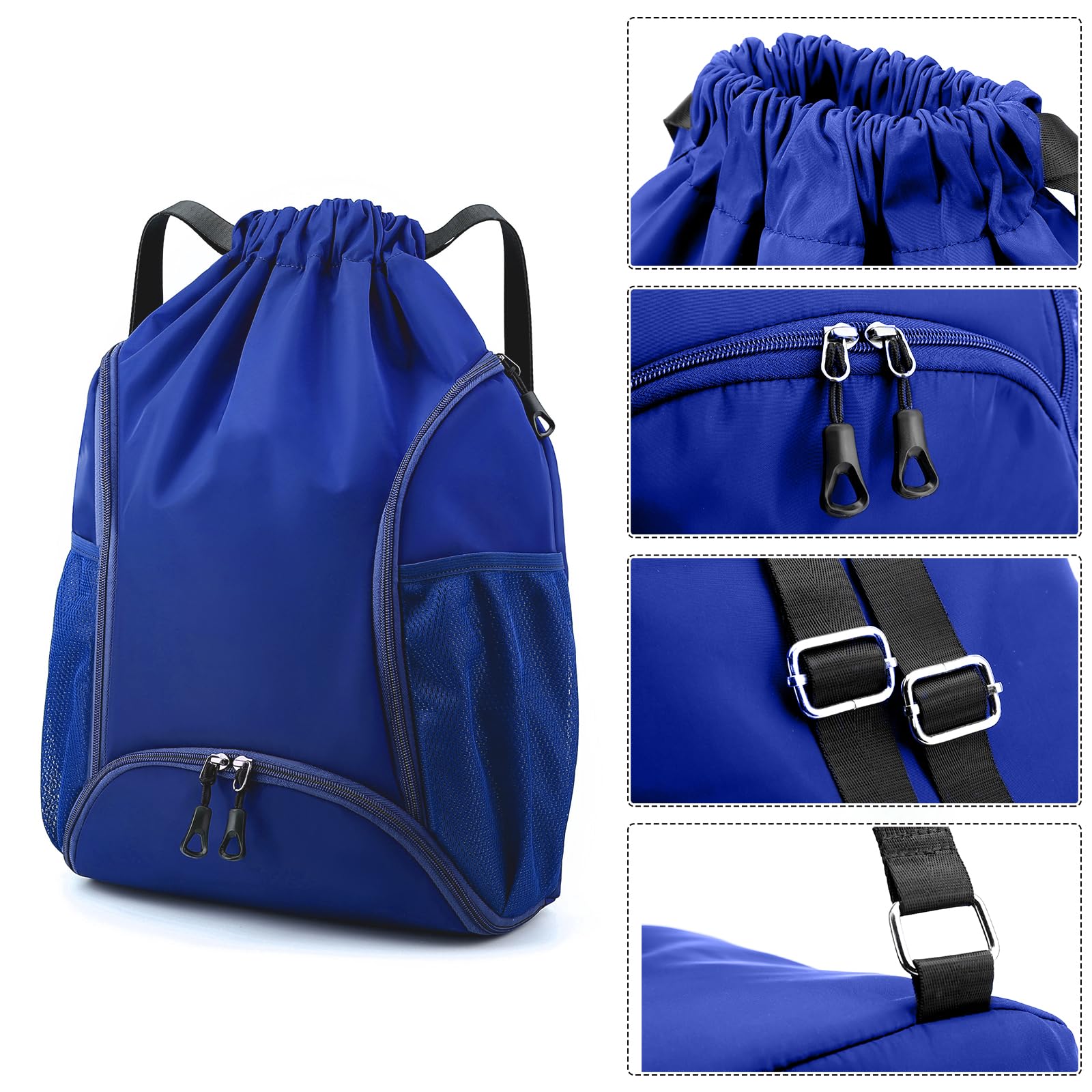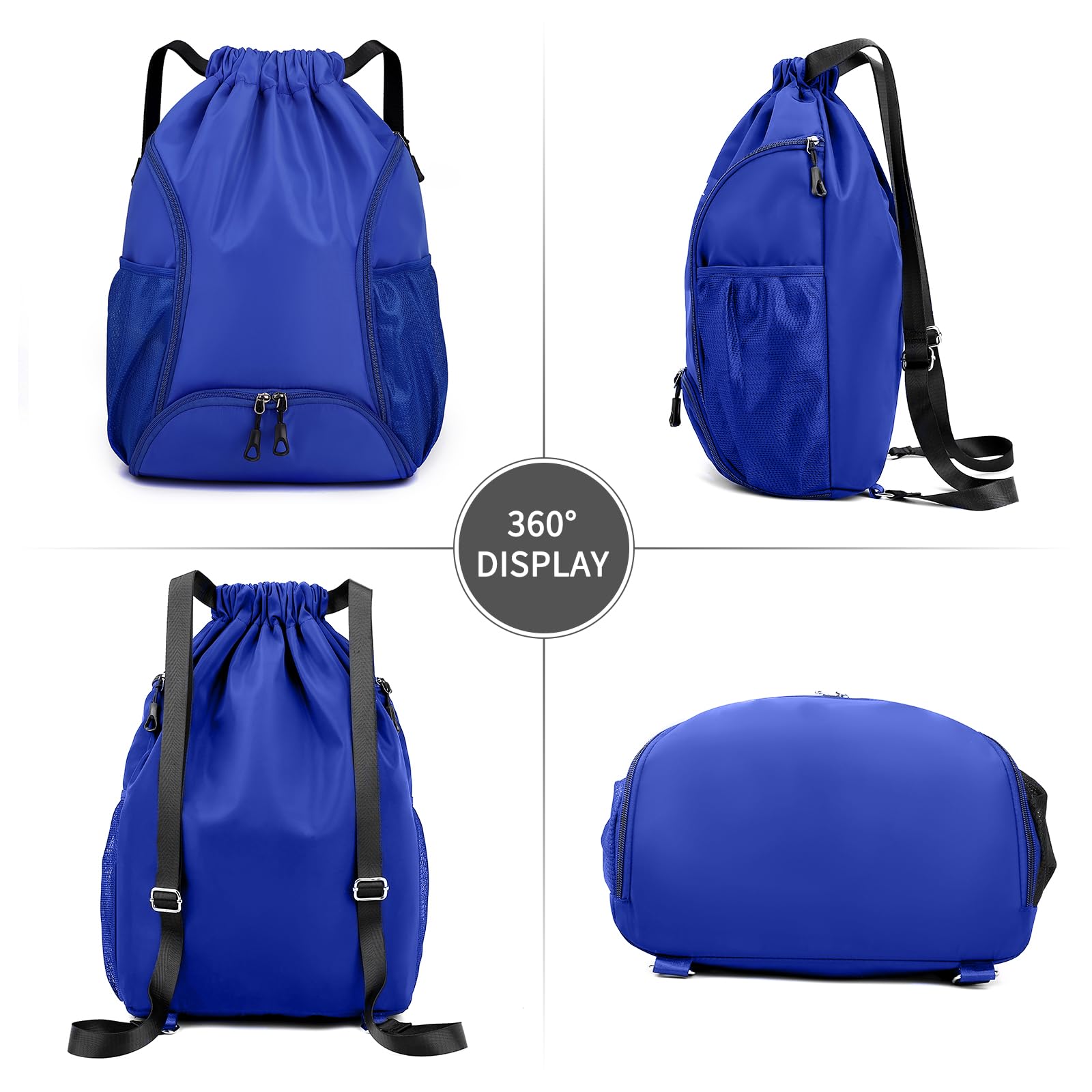 - Multiple compartments: The gym drawstring backpack has two side pockets, and a large shoe compartment to accommodate shoes. It contains zipper bags that can be placed in categories. The layers are clear, numerous and not cluttered. They can be accurately positioned and placed wherever you go. Accessible, two mesh pockets hold water bottles, umbrellas, sunscreen, and more;
