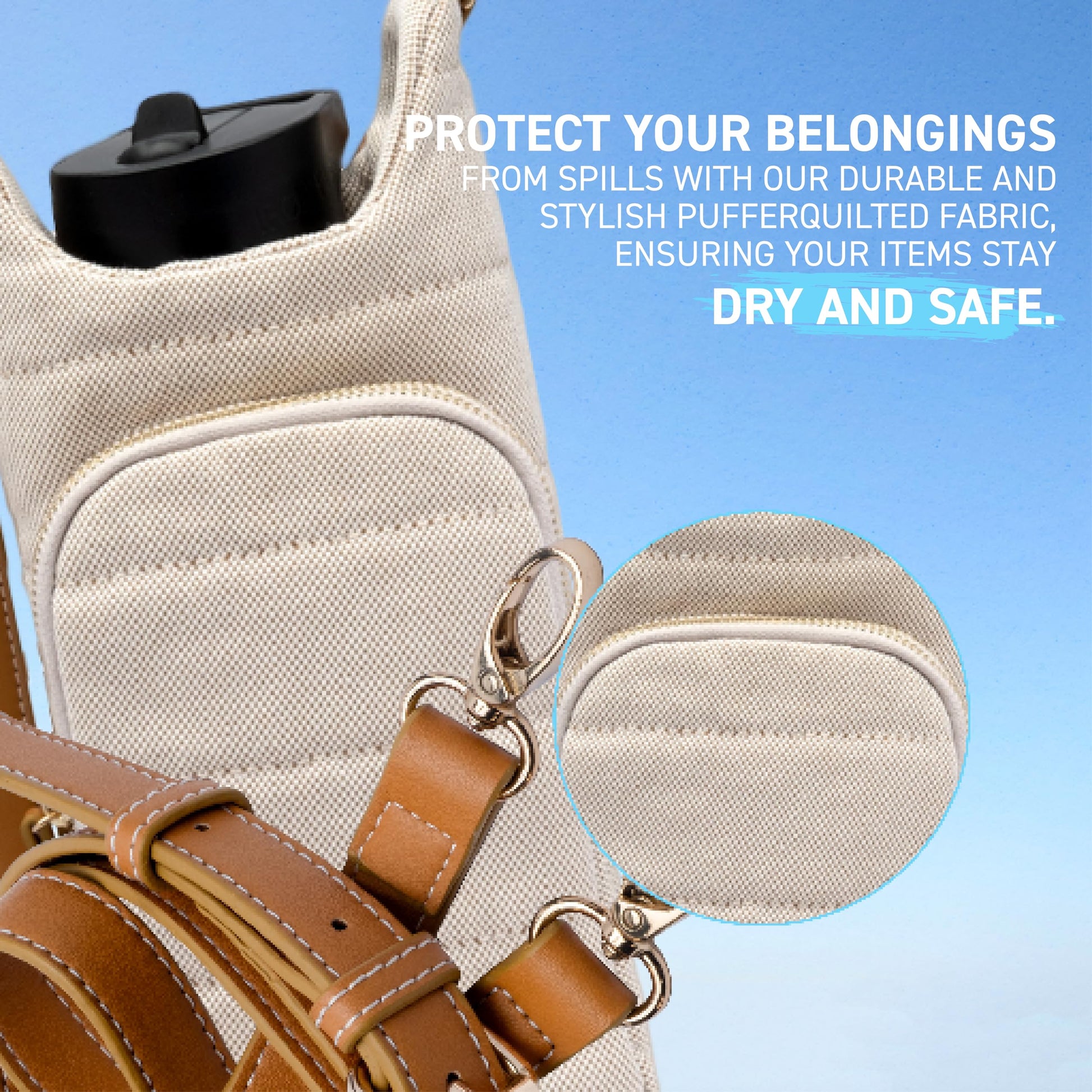 WanderFull Original Crossbody HydroBag | Quilted Water Bottle Carrier & Adjustable Vegan Leather Strap | Canvas Tote with Two Pockets for Phone & Accessories | Carry Travel Essentials (Oatmeal)
