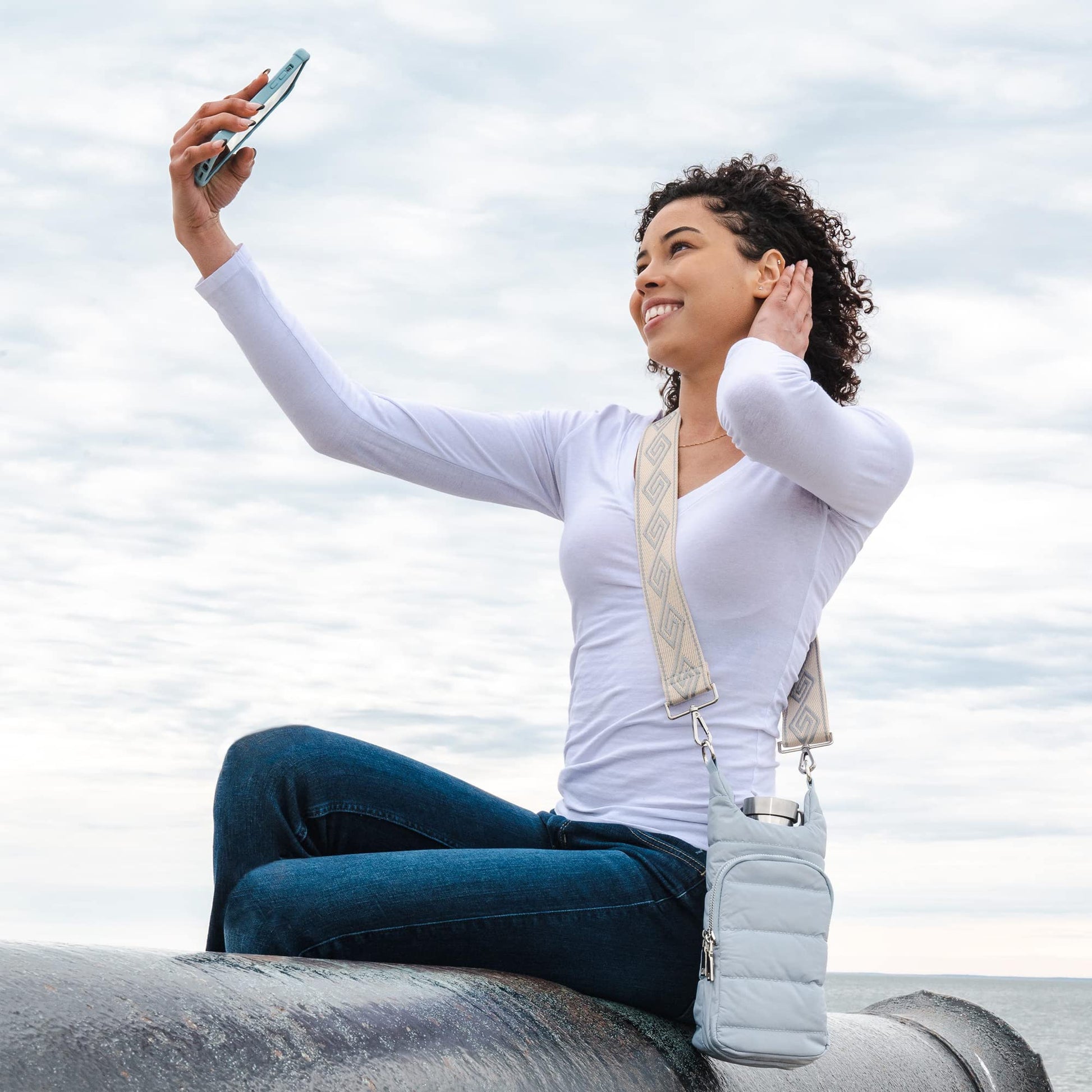 WanderFull Original Crossbody HydroBag | Quilted Water Bottle Carrier | Puffer Tote Tumbler Holder with Pockets for Purse, Phone & Accessories | Carry Travel Essentials (Grey/Patterned Strap)