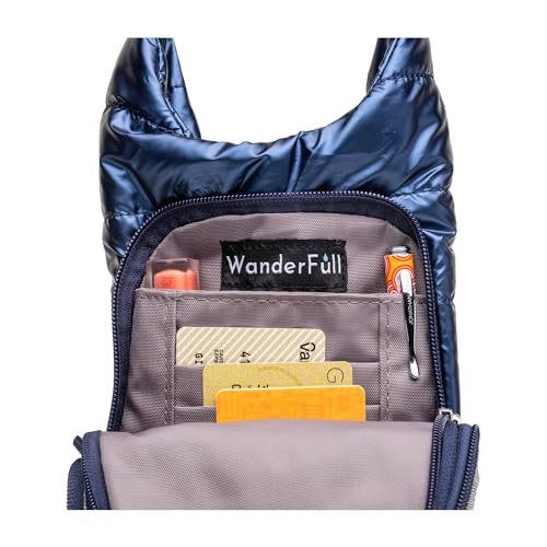 WanderFull Original Crossbody HydroBag | Quilted Water Bottle Carrier | Puffer Tote Tumbler Holder with Pockets for Purse, Phone & Accessories | Carry Travel Essentials (Navy Shiny & Solid Strap)