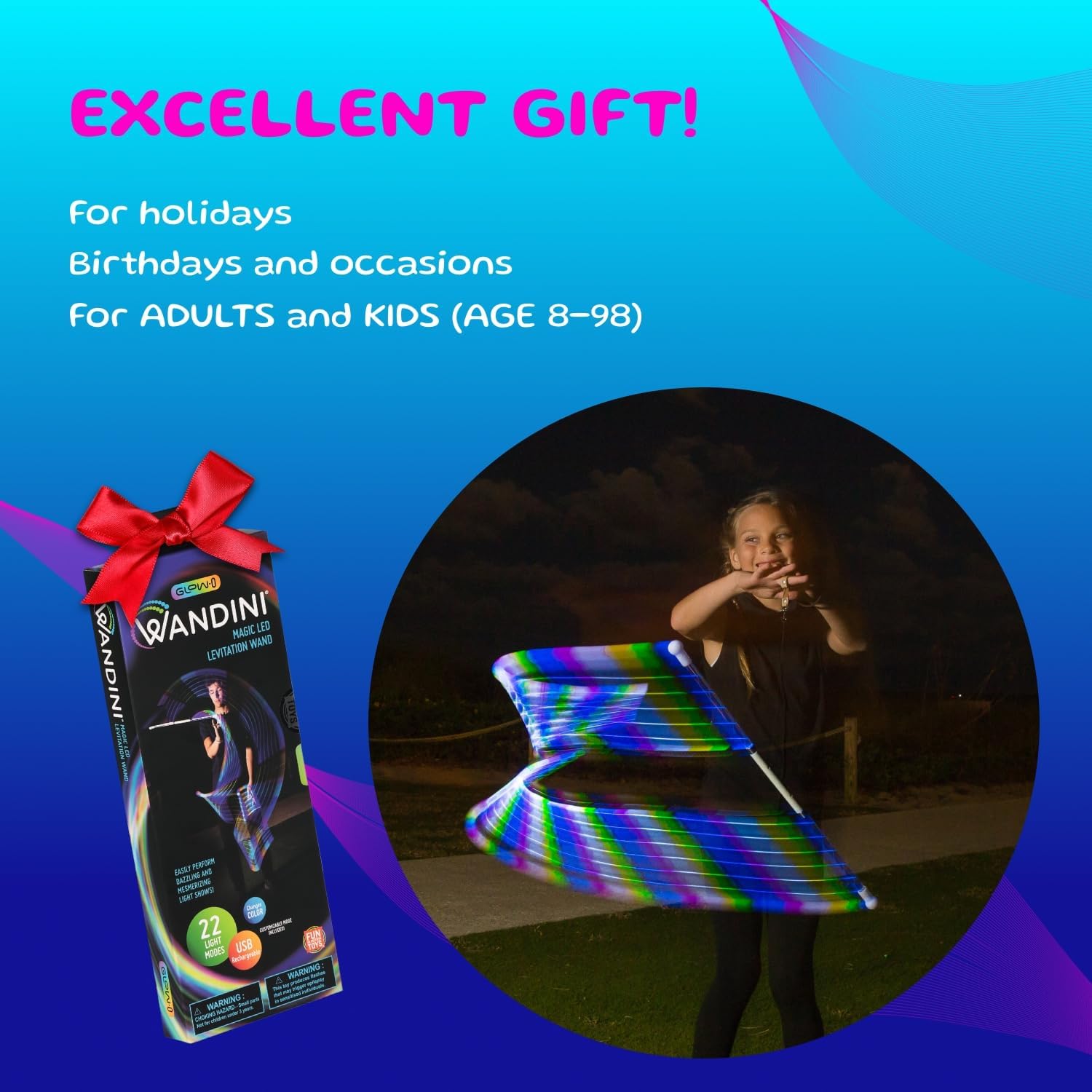 - 22 color light modes – The Wandini LED wand light features a full spectrum of 21 vibrant color light modes & patterns, plus 1 customizable setting for almost infinite possibilities. Our magic levitation light features an undetectable invisible string and a vegan leather strap with a middle finger loop. Paint the night with color & light!