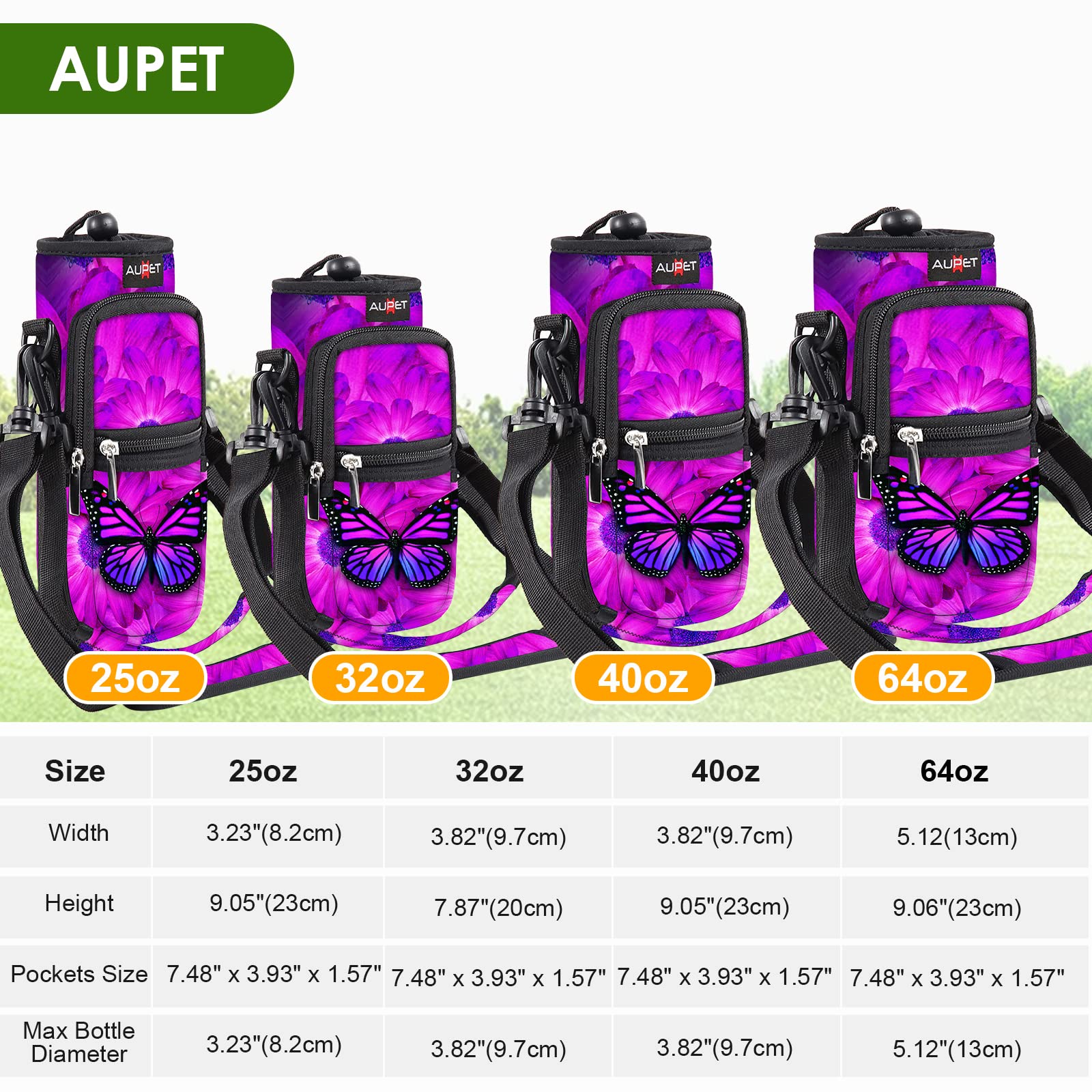 - AVAILABLE IN FOUR SIZES:Our AUPET water bottle crossbody bags has four sizes for you to choose,25oz/32oz/40oz/64oz,please refer to the picture to choose the right size