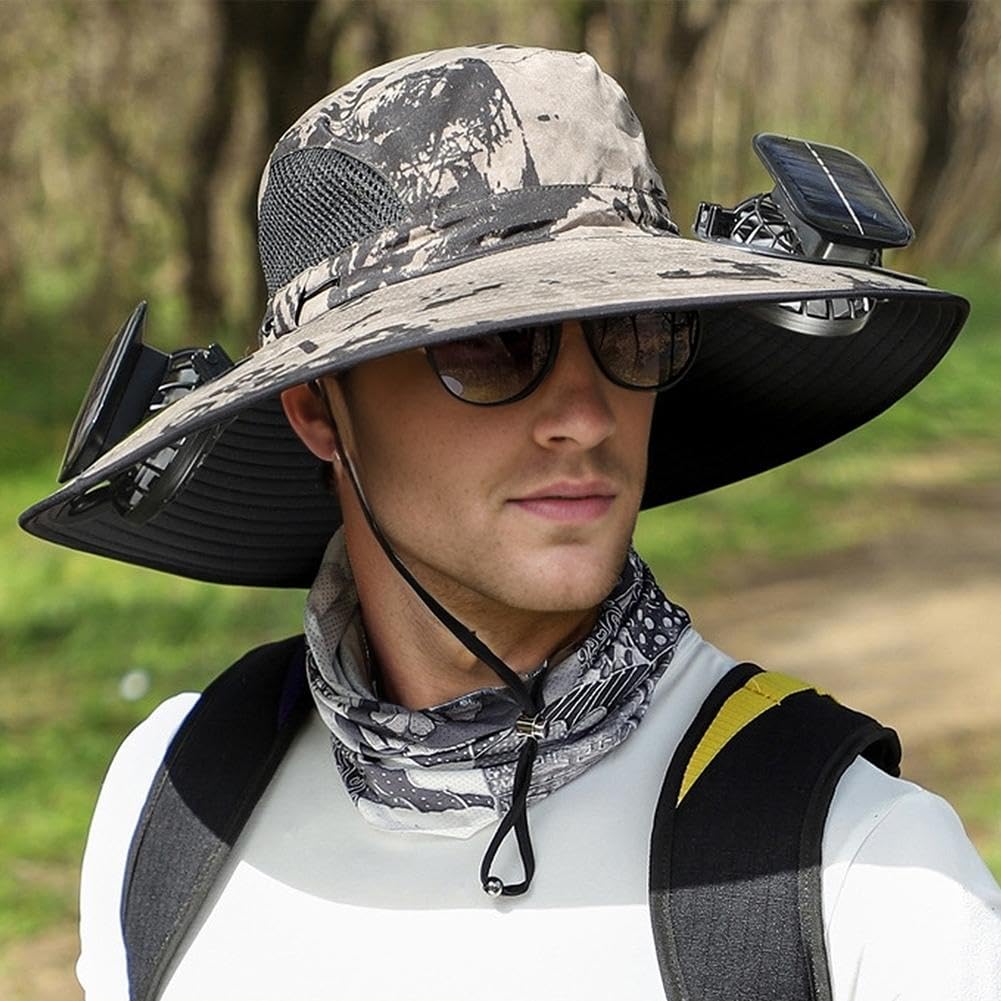 Wide Brim Sun Hat with 2 Solar Fan, Fishing Hat for Men, Solar Powered Fan Fishing Hats, 3 Speed Adjustable Fan Hat