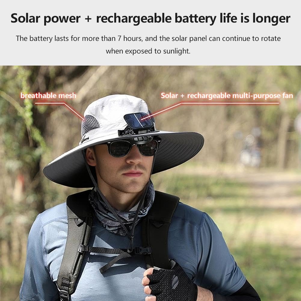 - TWO POWER SUPPLY MODES: Sun hat with fan has two power supply modes, solar power supply or usb charging, in solar mode, the fan starts automatically when exposed to sunlight. USB charger fan battery mode provides 7-9 hours of runtime, and 7 fan blades provide long-lasting powerful airflow. This fisherman hat, suitable for outdoor enthusiasts, outdoor workers to provide better protection!