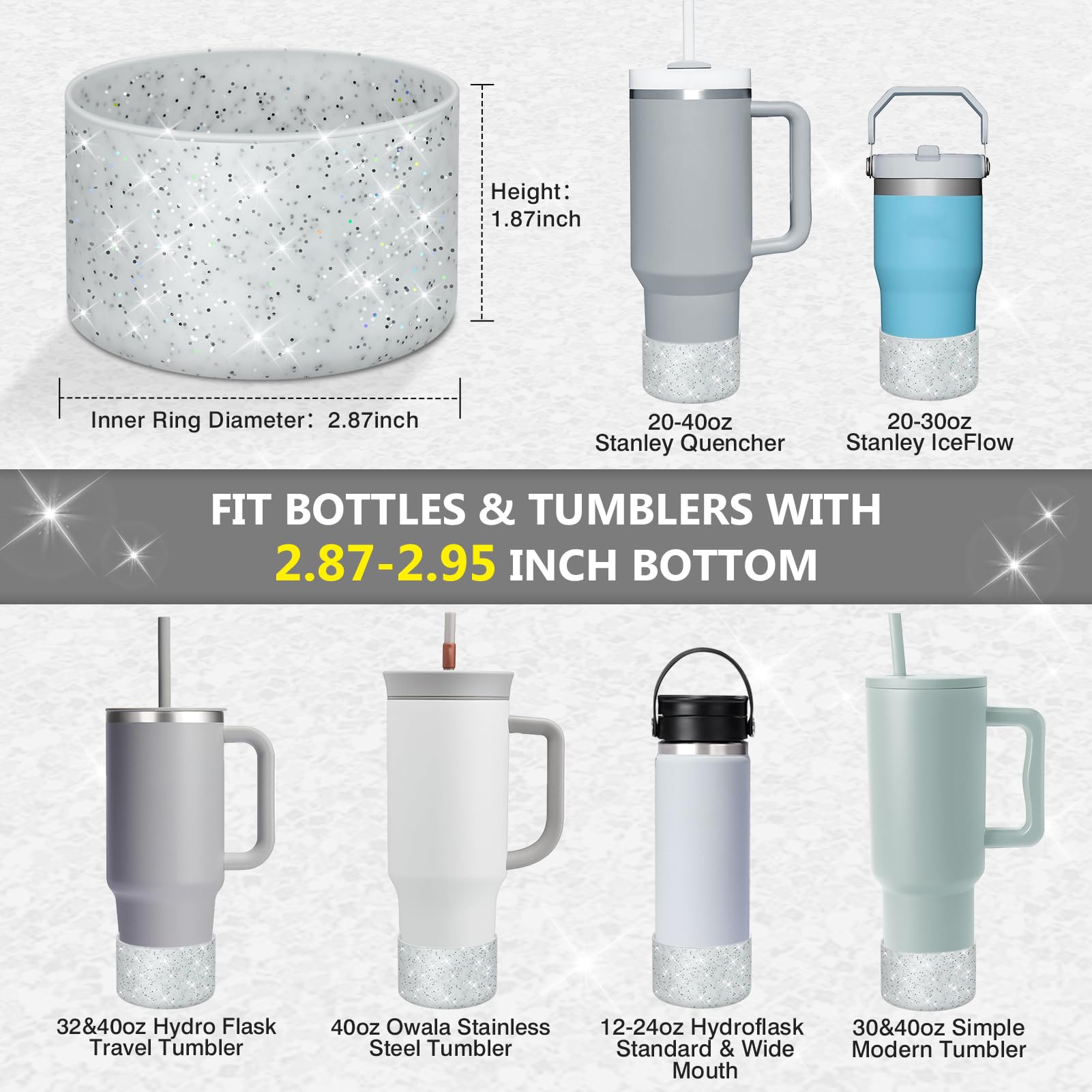 - UNIVERSAL COMPATIBILITY: Designed for bottles with a base diameter of 2.8-3 inches, this dazzling water bottle boot isn't just compatible with Stanley products. It is also compatible with Hydroflask 12-24 oz water bottles