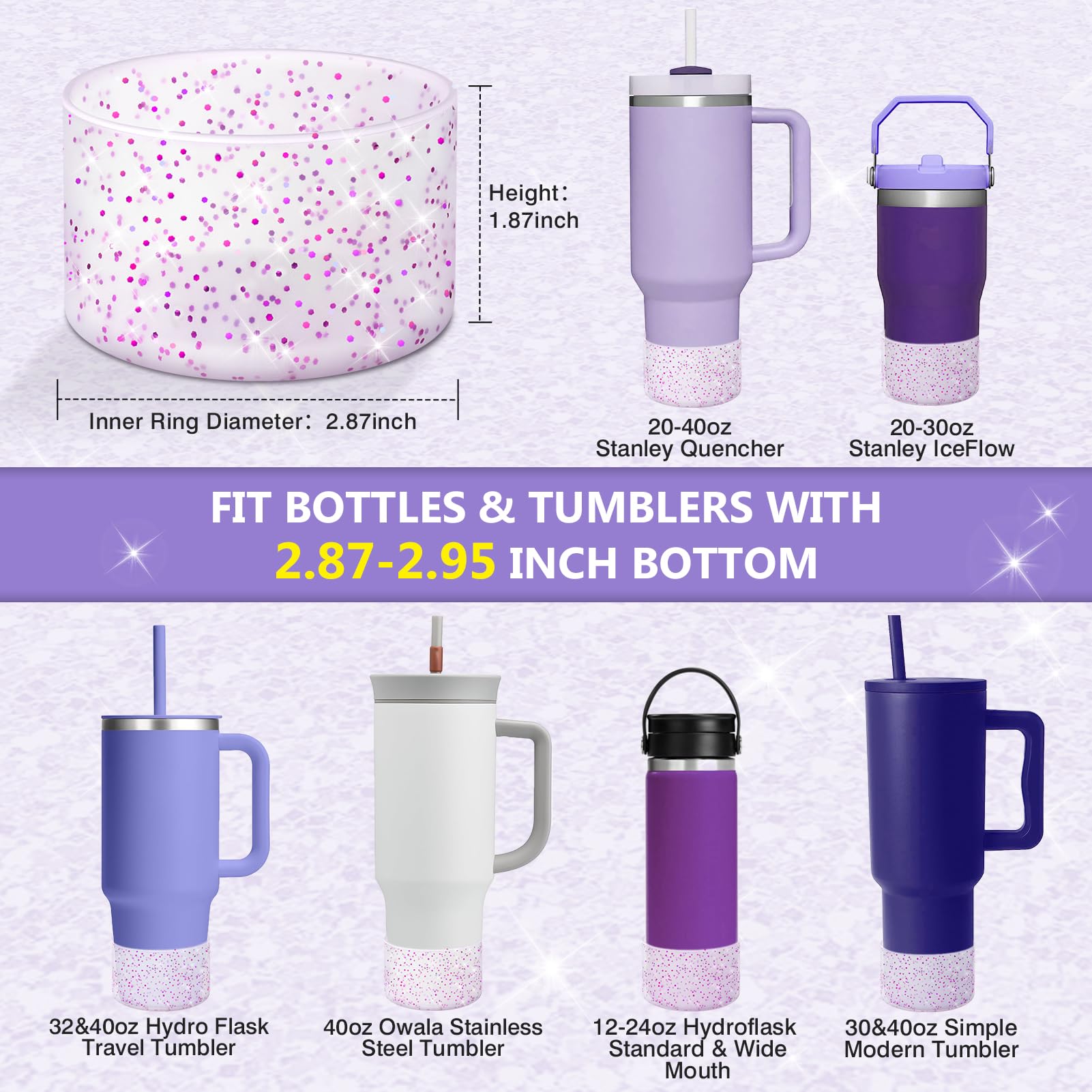 - ★ UNIVERSAL COMPATIBILITY — Designed for bottles with a base diameter of 2.8-3 inches, this dazzling water bottle boot isn't just compatible with Stanley products. It is also compatible with Hydroflask 12-24 oz water bottles.