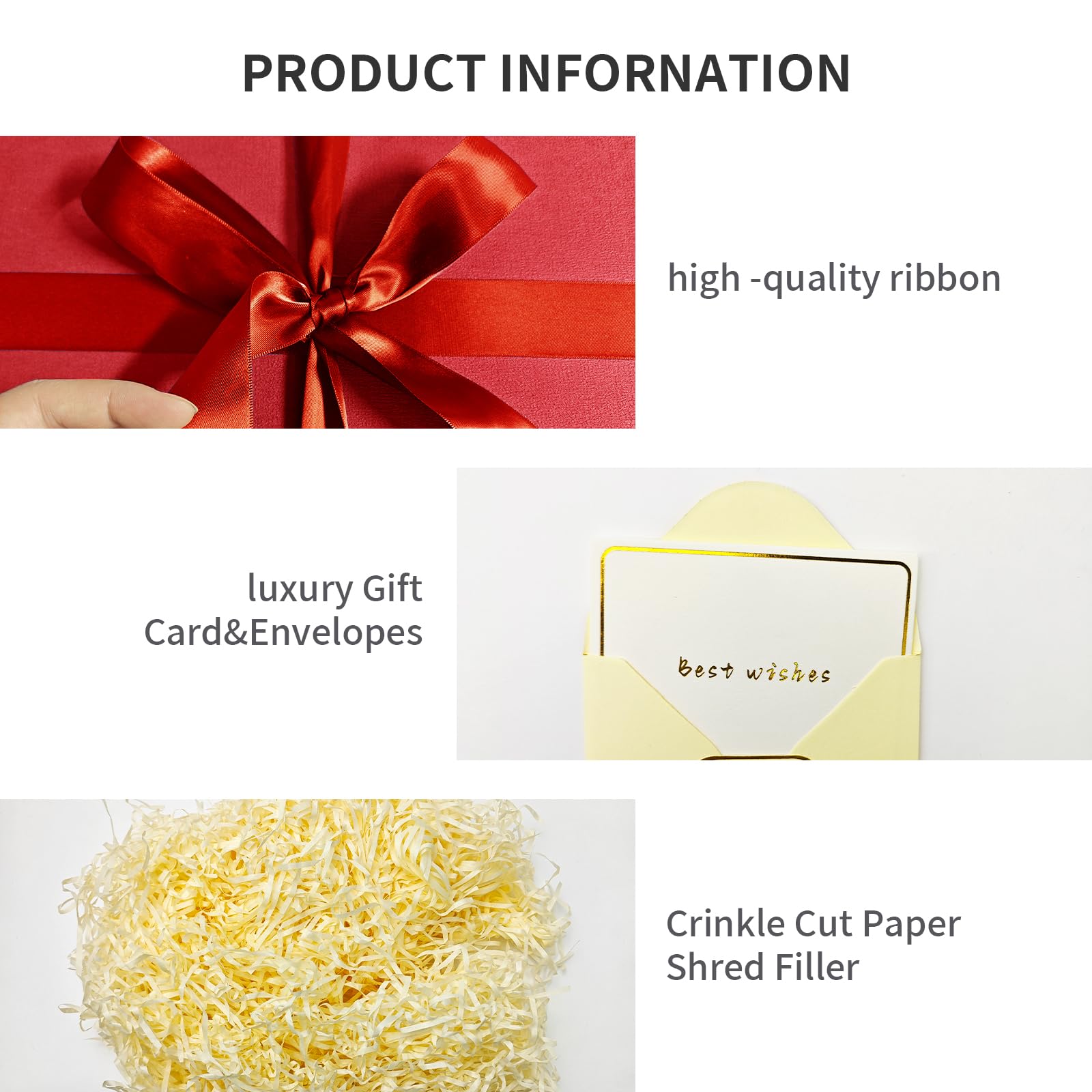 - 【Package Includes】1*Premium Red Gift Box,1*Blank Gift Card Set,1*Roll Satin Luxury Ribbon(118inch ),1*Pack of shredded filler.everything you need for a beautifully wrapped gift.Please verify the size before purchasing to ensure it meets your needs.