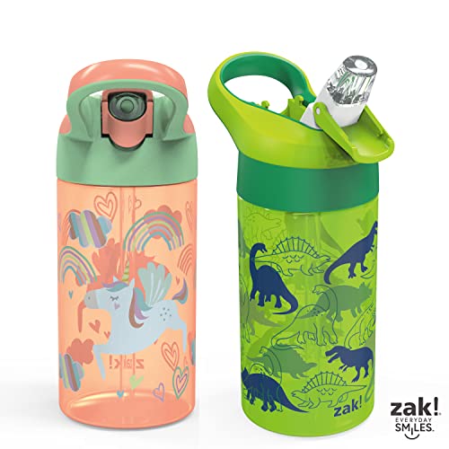 Details: Let kids enjoy hydration with fun water bottles by Zak Designs! Reusable and Durable Material: Reusable water bottles will last wash after wash; good for you and good for the environment! The drinking bottle is made of plastic, which is BPA free, dishwasher safe, and durable enough for kids to use every day. Leak-Proof Lid: The lid screws on securely and won't leak when the spout is closed. A button release to flip up the spout keeps drinks easy to access. On the Go: The water bottle has a built-in carrying loop on the lid for easy transportation and fits in most car cup holders, with a cover to help keep the spout clean. Specifications: Set includes 2 water bottles with different designs. 16 oz capacity. Made of durable plastic. BPA free - Zak is committed to safety. Dishwasher safe, do not microwave. Length: 3.88-inch, Width: 2.83-inch, Height: 7.27-inch. Design: Unicorn and Dino Camo.