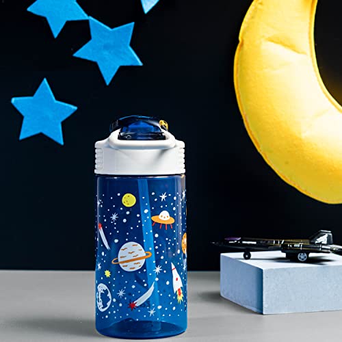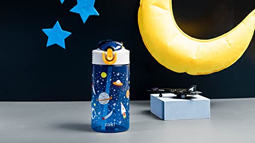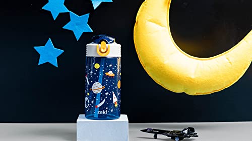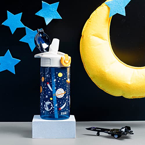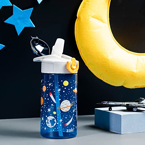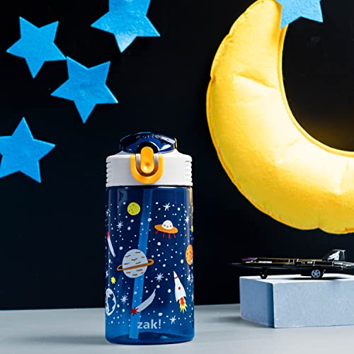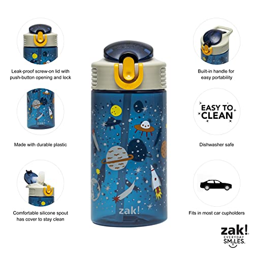 Zak Designs Kids Water Bottle For School or Travel, 16oz Durable Plastic Water Bottle With Straw, Handle, and Leak-Proof, Pop-Up Spout Cover (Space)