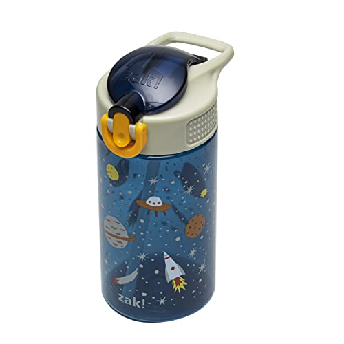 Details: Let kids enjoy hydration with a fun water bottle by Zak Designs! Reusable and Durable Material: Reusable water bottles will last wash after wash—good news for you and the environment! The 16 oz water bottle is made of PP plastic, durable enough for kids to use every day and bring on any adventure. Leak-Proof Lid: The lid screws on securely and won't leak when the spout is closed, though water flows for easy drinking when the spout is open. The easy-open button has a flip-up lock to keep it from activating accidentally. On the Go: The water bottle has a built-in carrying loop on the lid for easy transportation, and with the spout cover to keep the spout clean and closed, it can be tossed into a bag for worry-free travel. Specifications: 16 oz capacity. Made of durable plastic. BPA-Free - Zak is committed to safety. Dishwasher safe, do not microwave. Length: 4.23-inch, Width: 2.75-inch, Height: 6.61-inch. Design: Space.