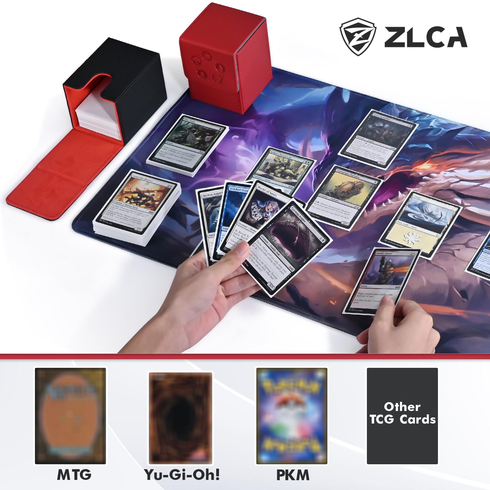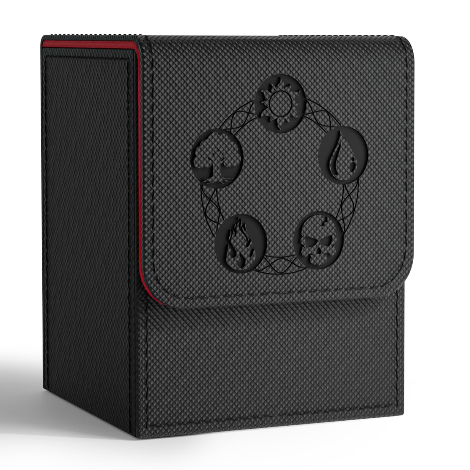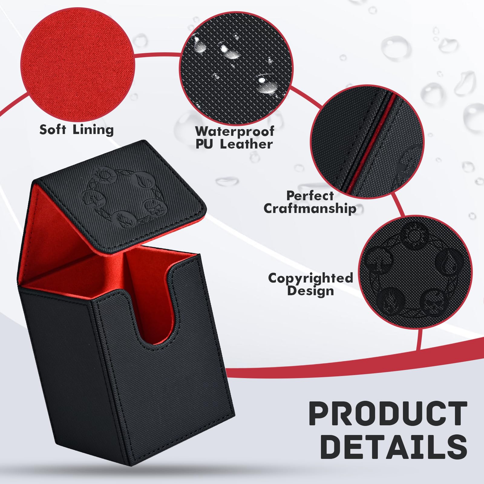 ZLCA Card Deck Box for Trading Cards with 2 Dividers, Card Storage Box Fits 100+ Single Sleeved Cards, PU Leather Strong Magnet Card Deck Case Holder for Magic Commander TCG CCG (Black&Red)