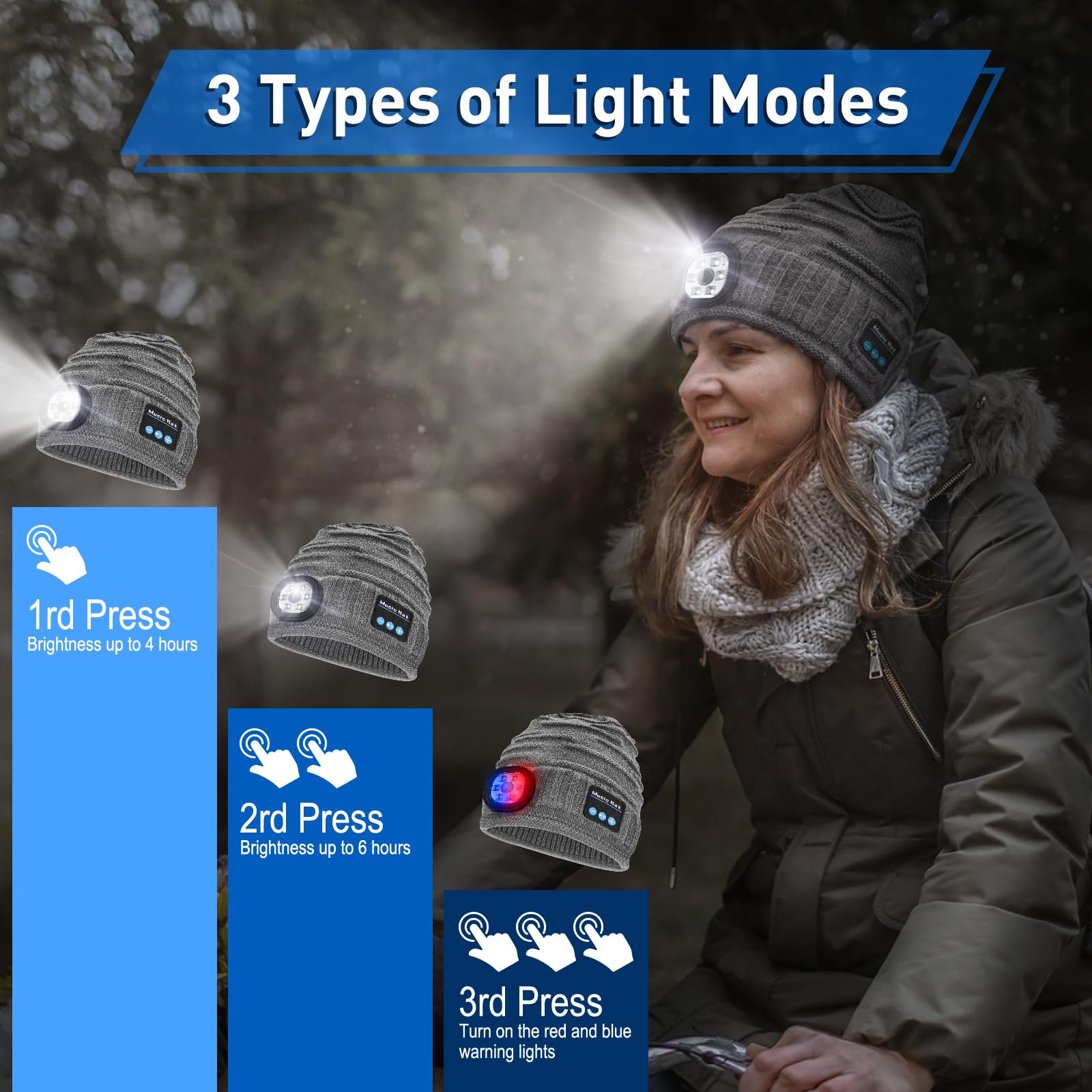 - 【Cool Stuff for Men】Our beanie with light has 5 built-in LED lights, which can illuminate up to 30 feet, with 2-speed incandescent lights and 1-speed red and blue flashing lights. The low-end and red and blue flashing lights can last up to 8 hours, and the high-end can last up to 4 hours. Allow you to free your hands for a night or morning run