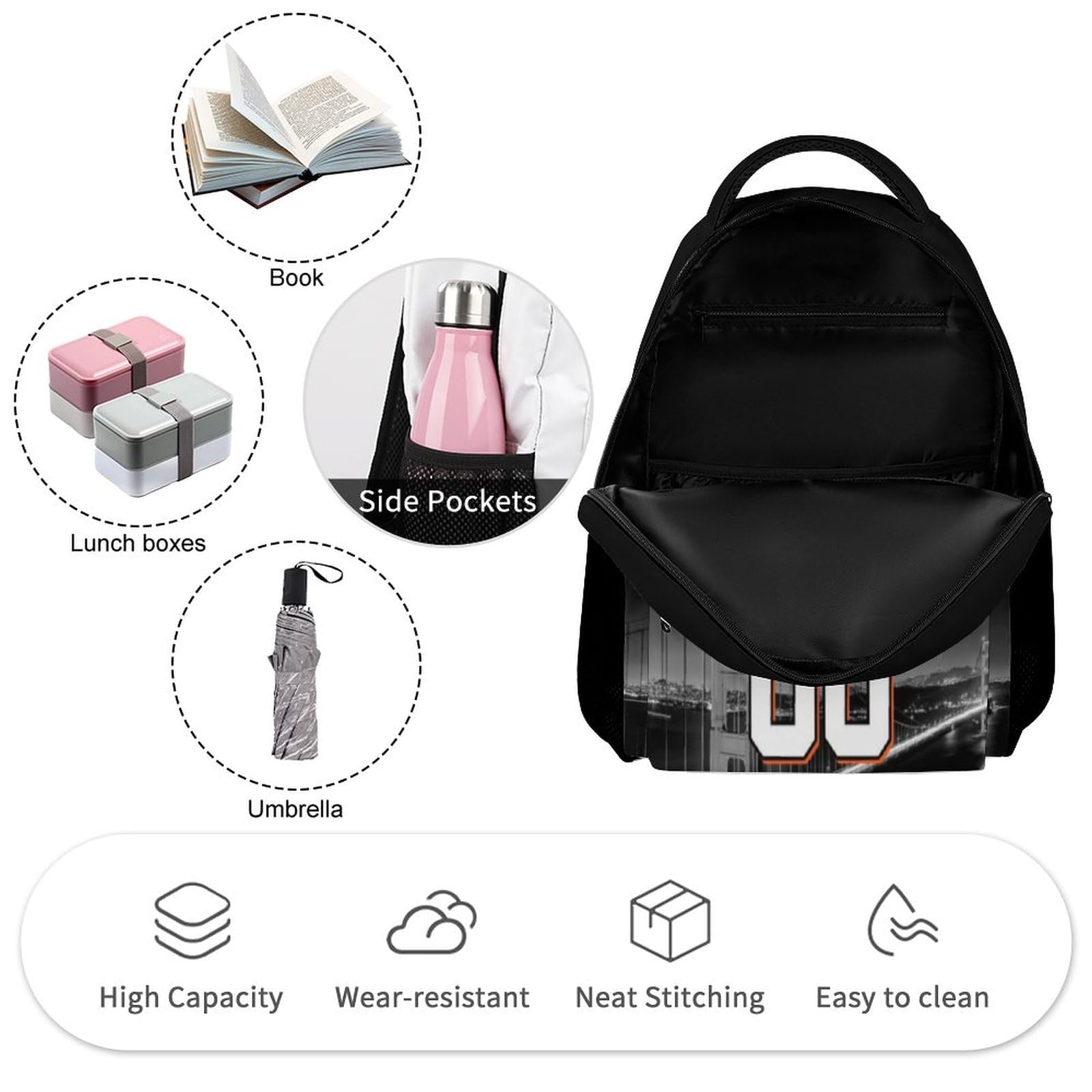 - High quality polyester, strong and durable. Inside there is a large zippered main pocket and two side mesh pockets. This backpack is large enough to hold laptop, water bottle, umbrella and more.